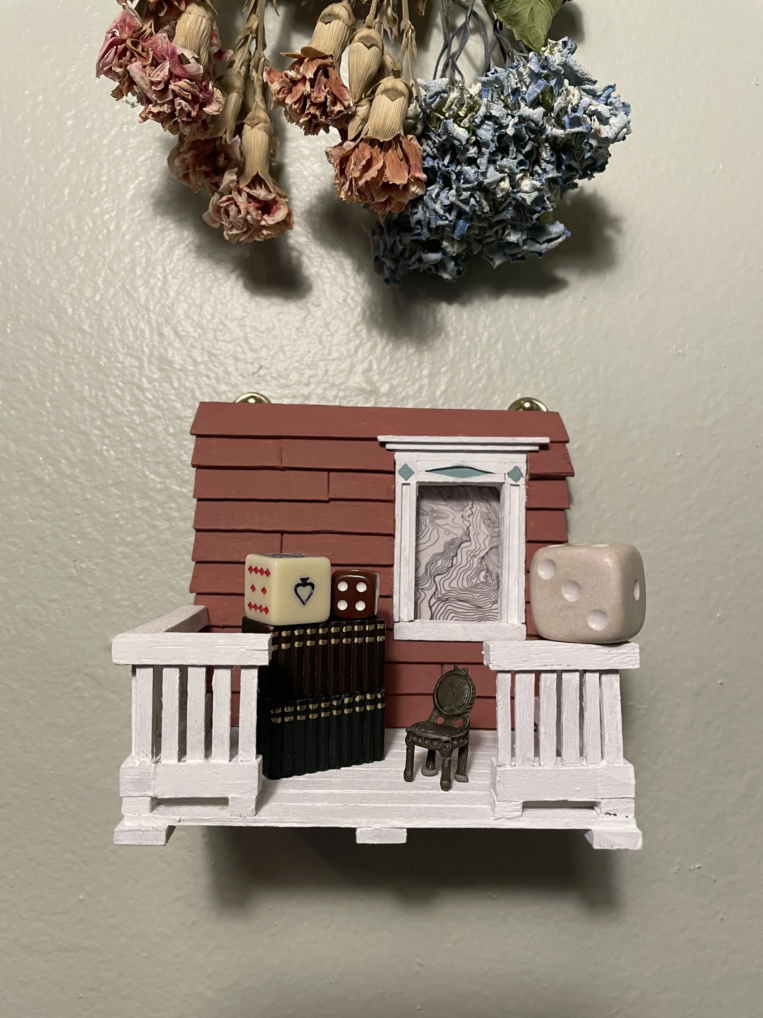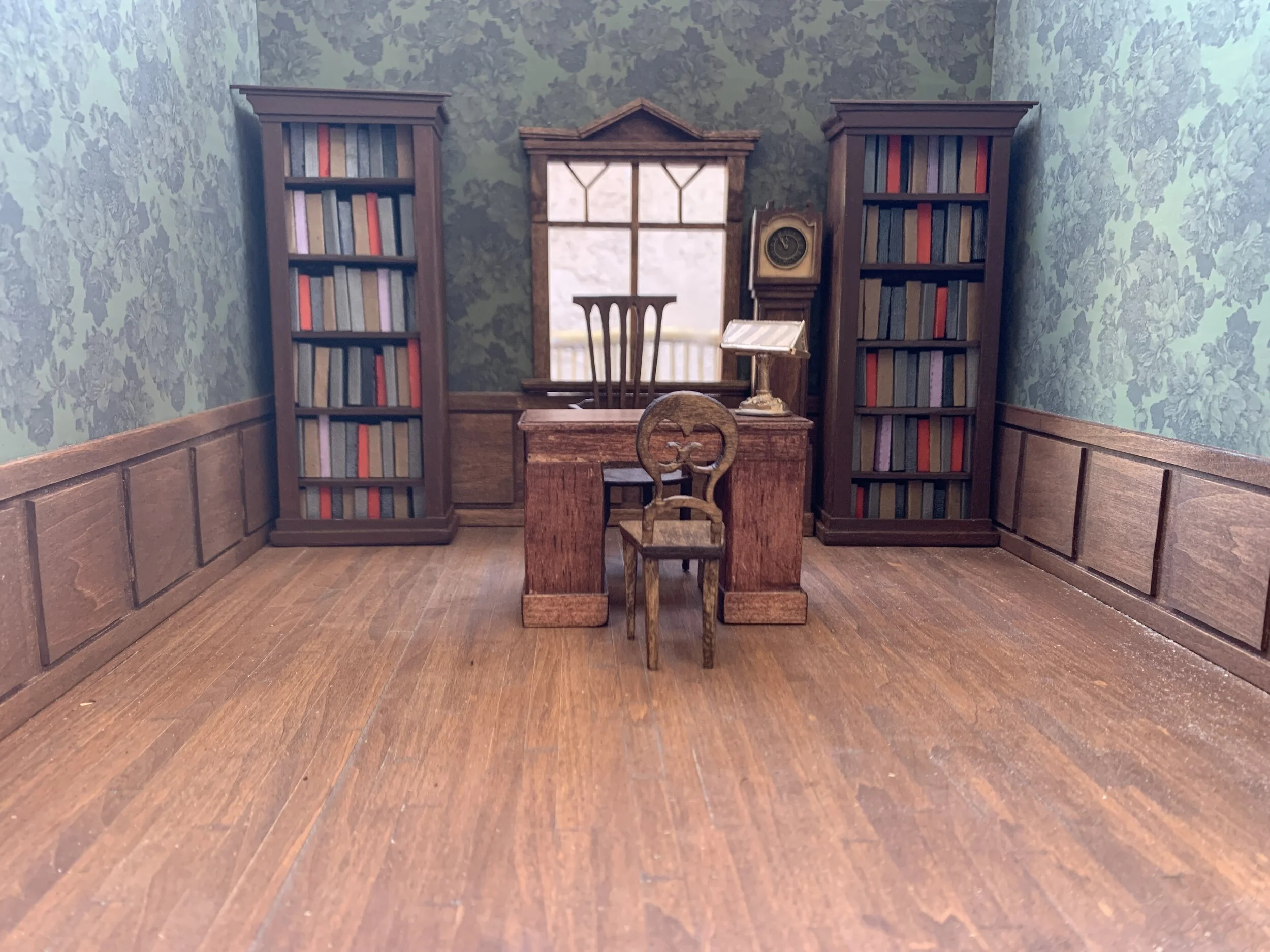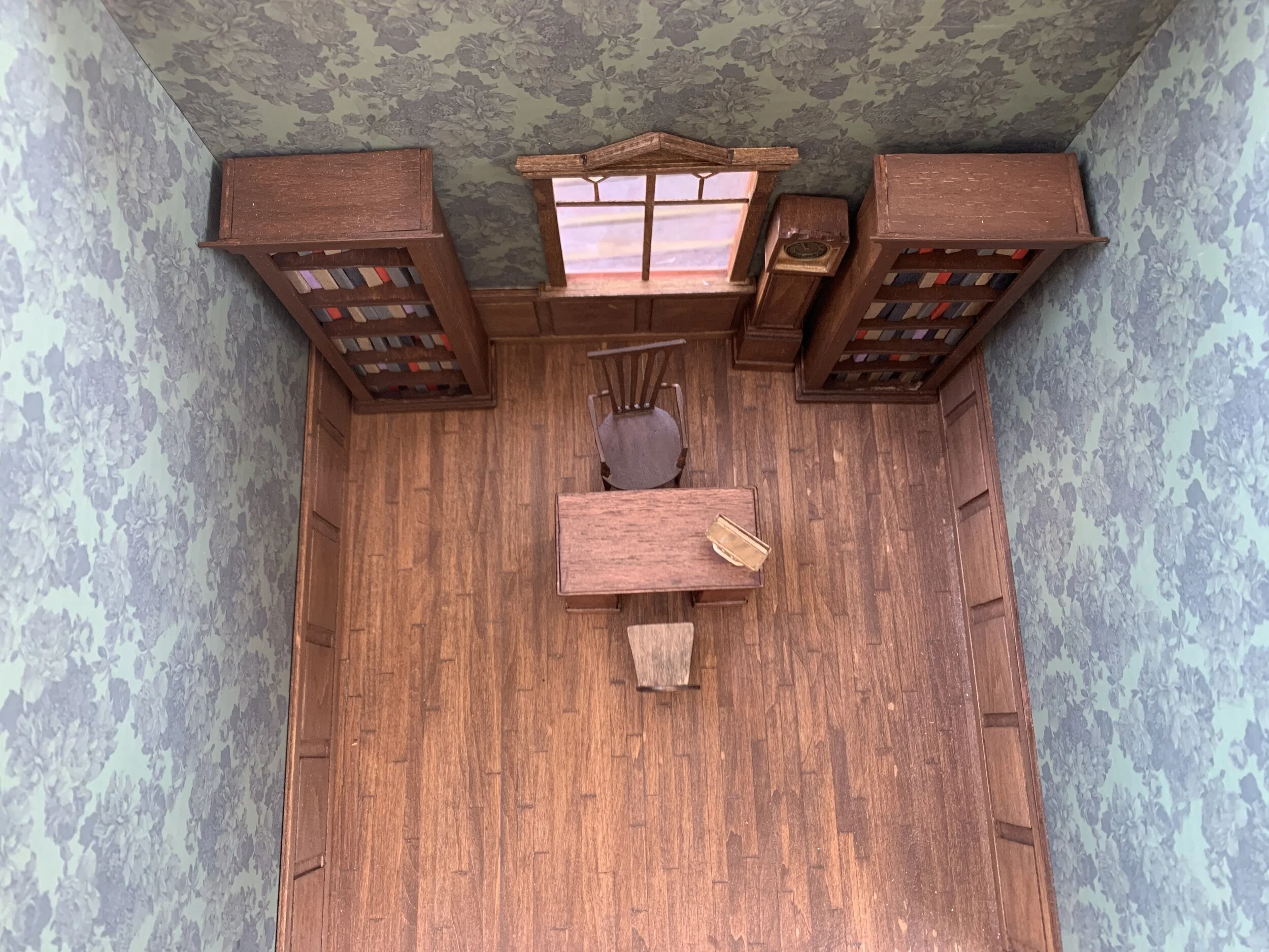 1:9th scale model of Dr. Crane’s Arkham Asylum office from the set of The People’s Joker (2021). Wood, paper, and clay.