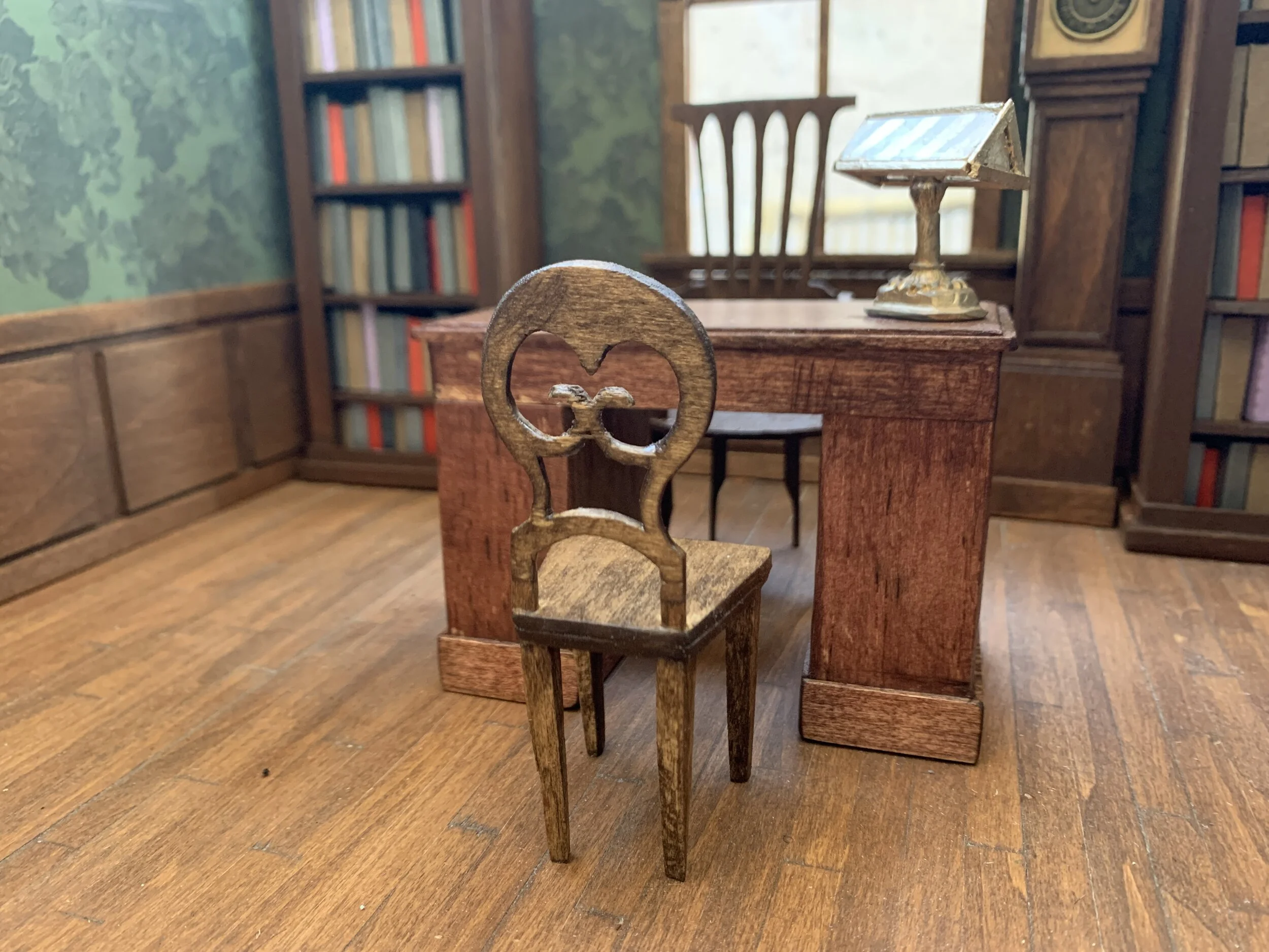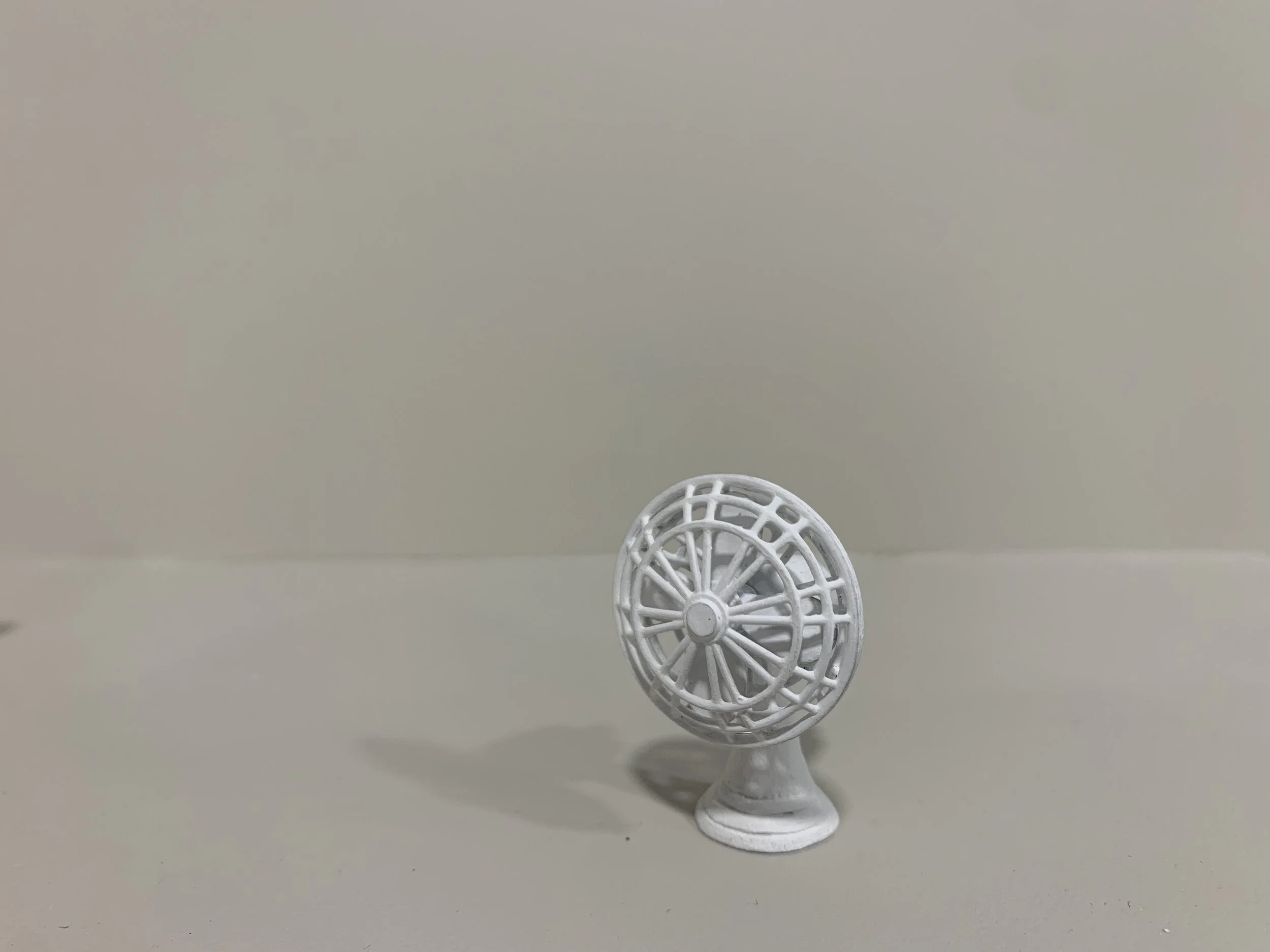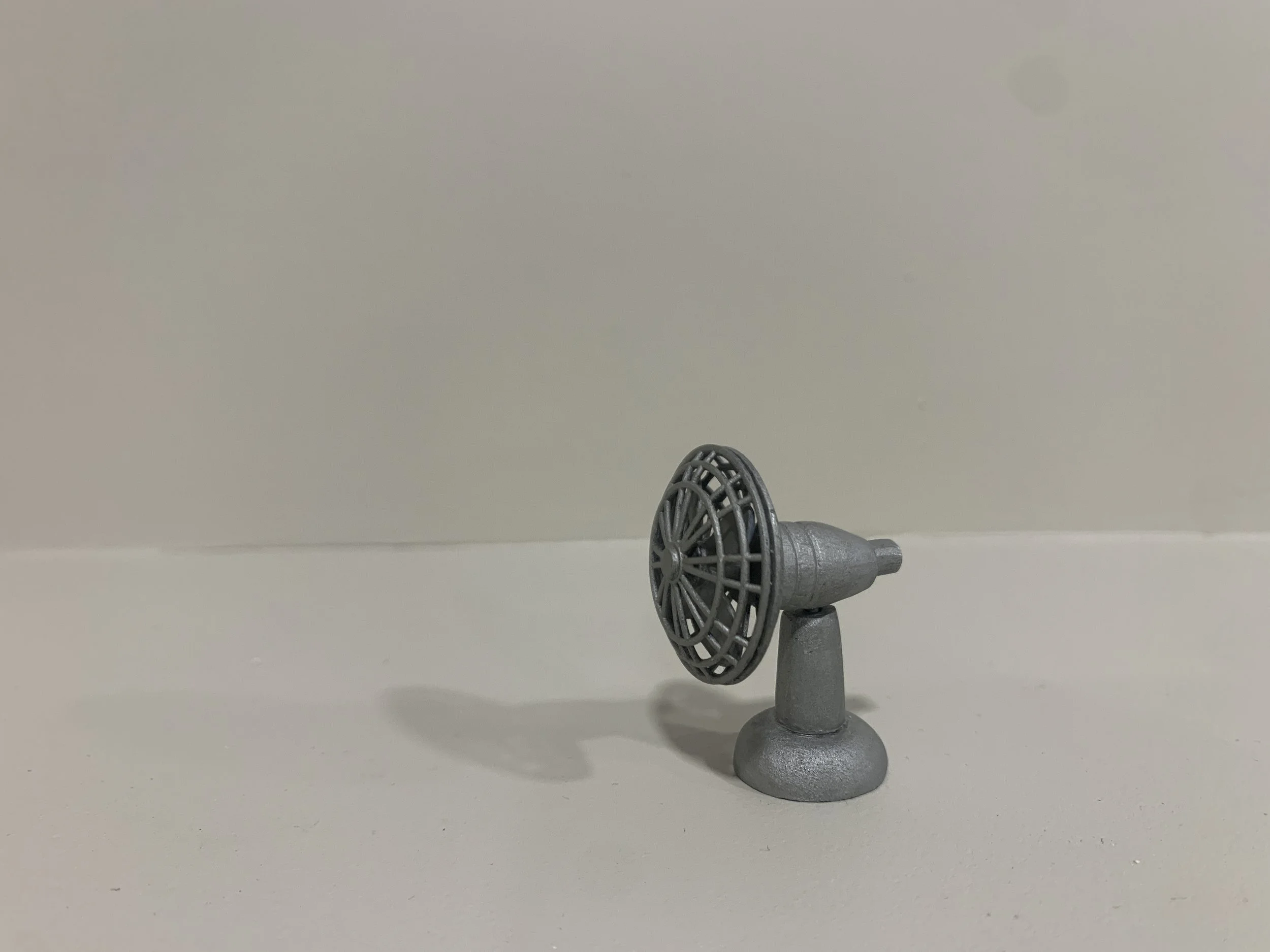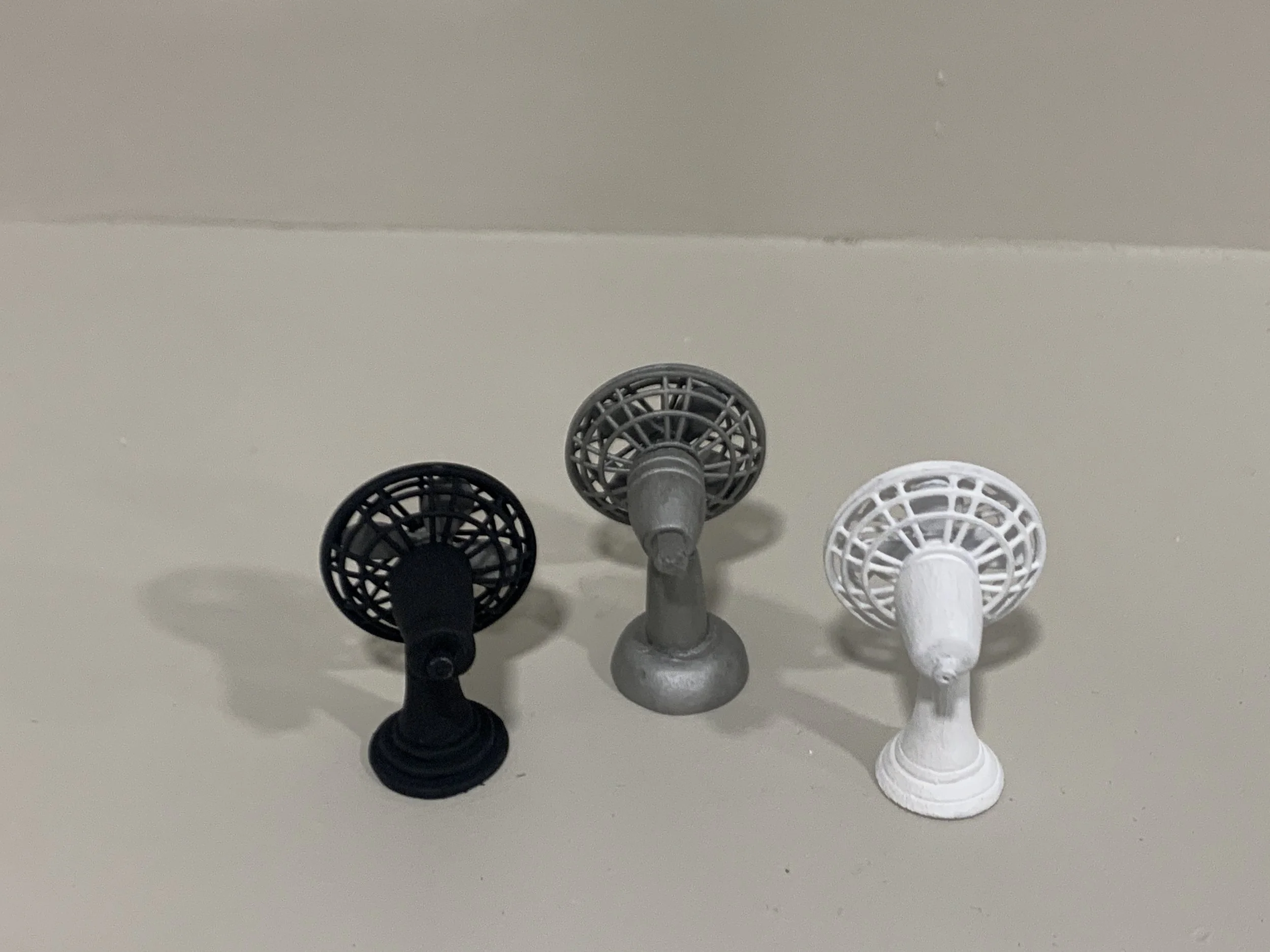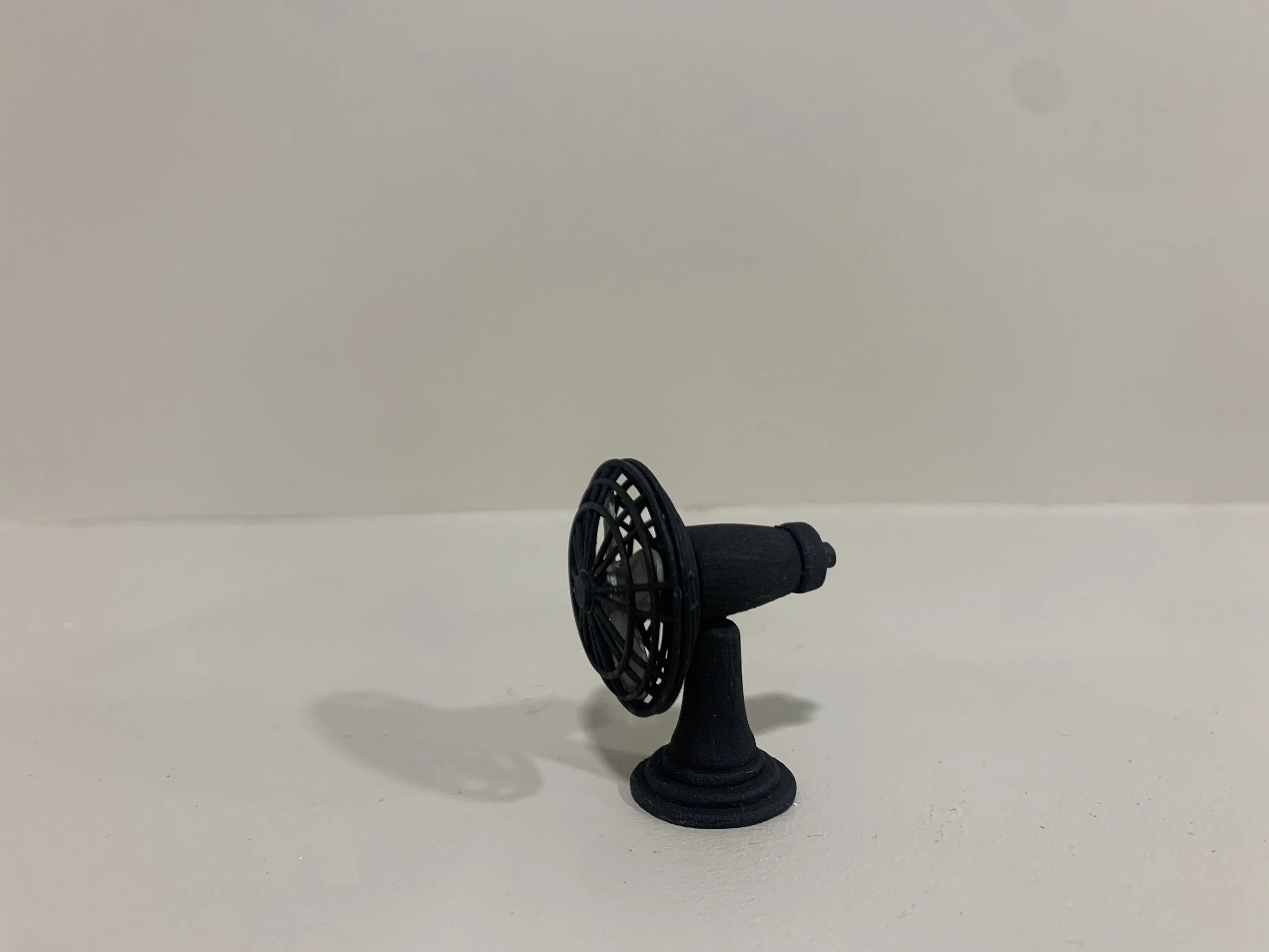 The difference between a cool miniature and a jaw-dropping one? Functionality. I designed these 1.5 in. tall fans for a stop-motion filmmaker so that she could animate the fans oscillating and the blades spinning. Materials used: styrene plastic, wood dowels.
