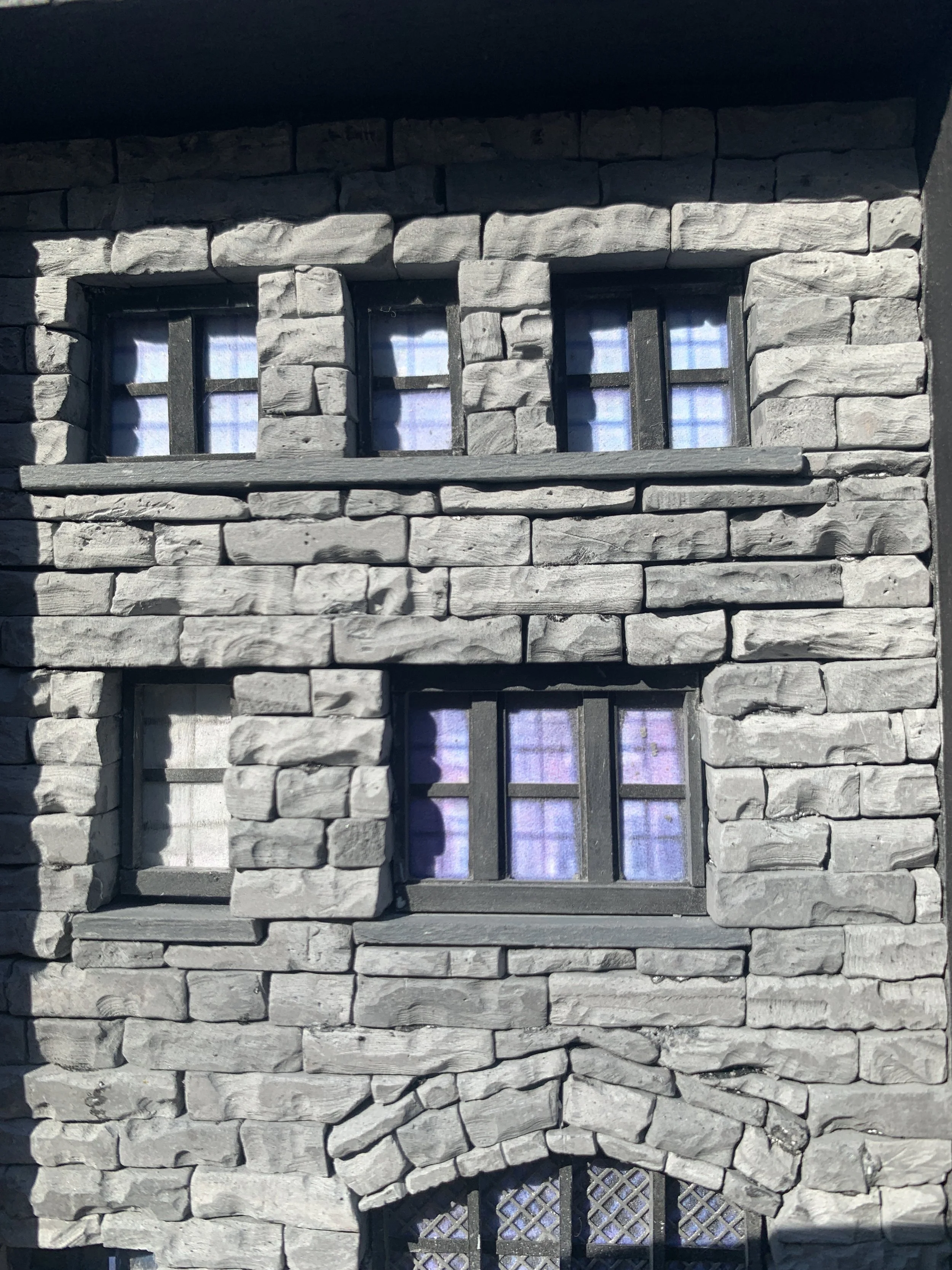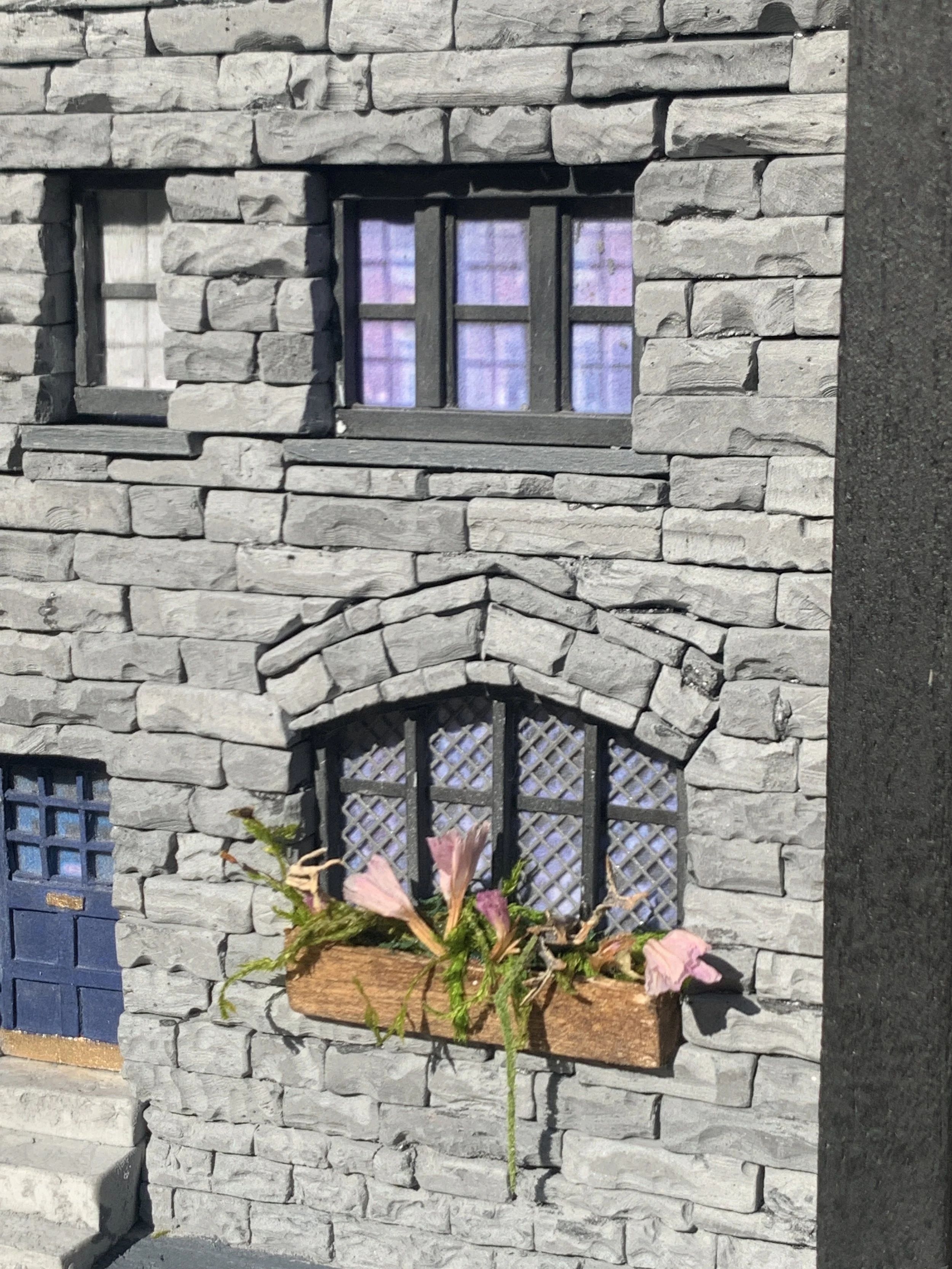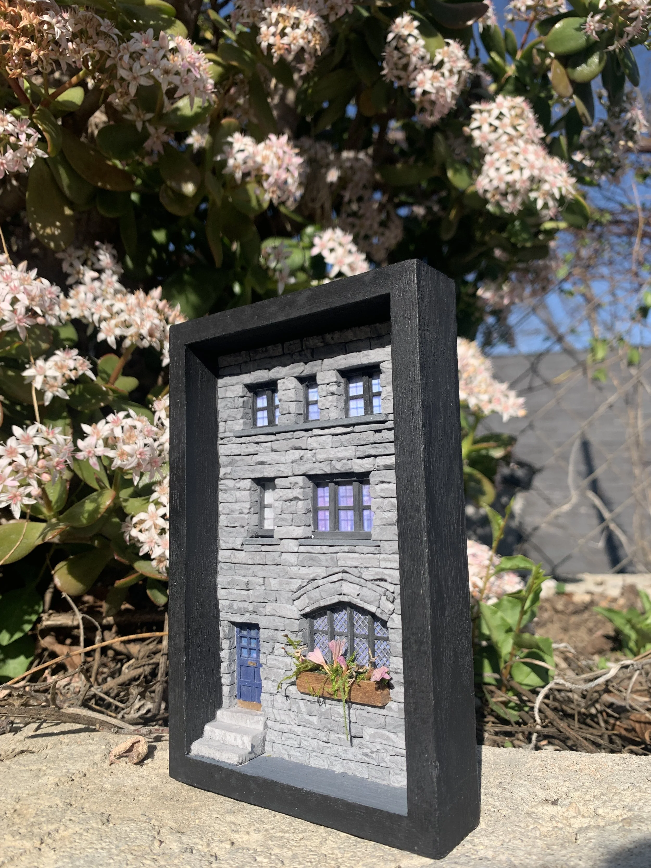 Arkham Asylum exterior in 1:87th scale for the set of The People’s Joker (2021). 3D print design by GoldRushBay. Paint, landscaping, and stone path by myself.