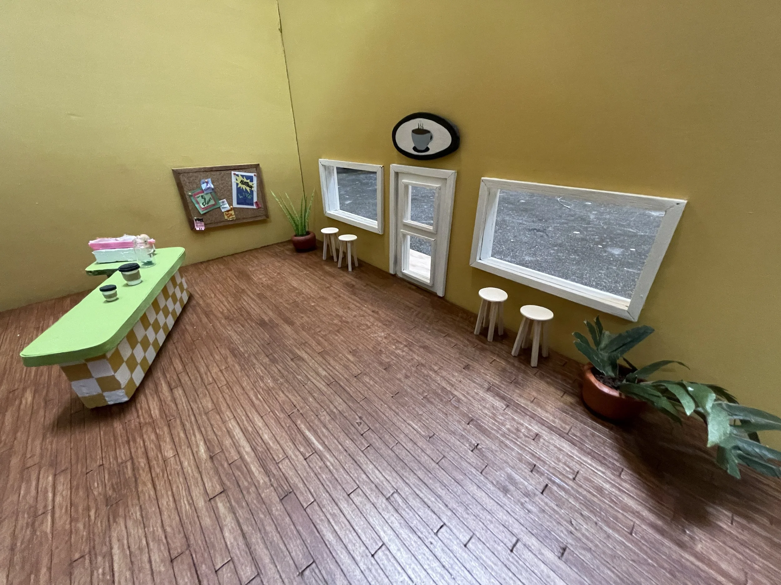 Cutesy coffee shop for a Super Pets stop motion toy commercial. Carved foam to appear like wood, basswood, clay, and paper.