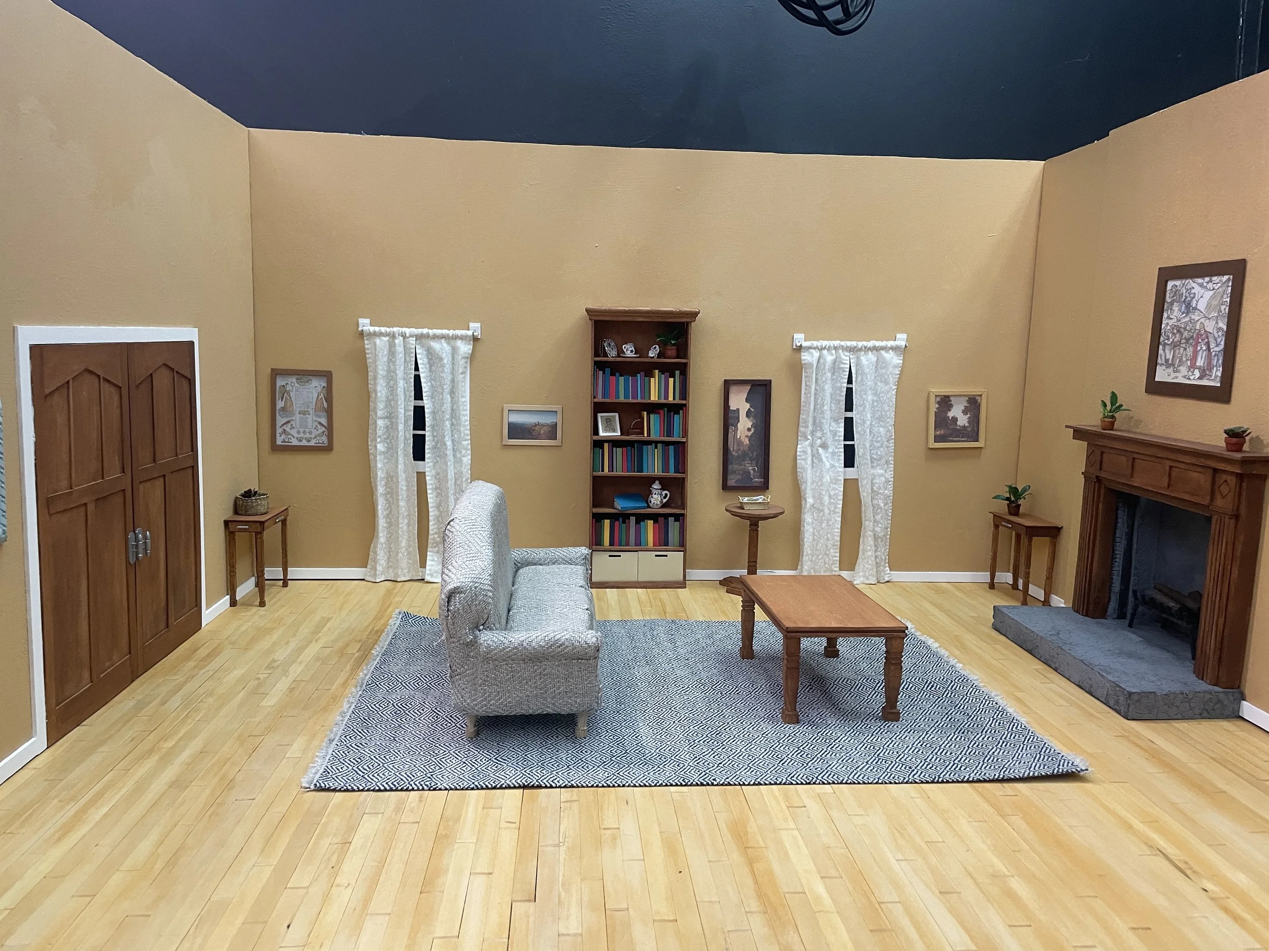 1:6 scale living room scene for “One Final Day,” a stop motion animated music video. Wood, foamcore, paper, textiles.